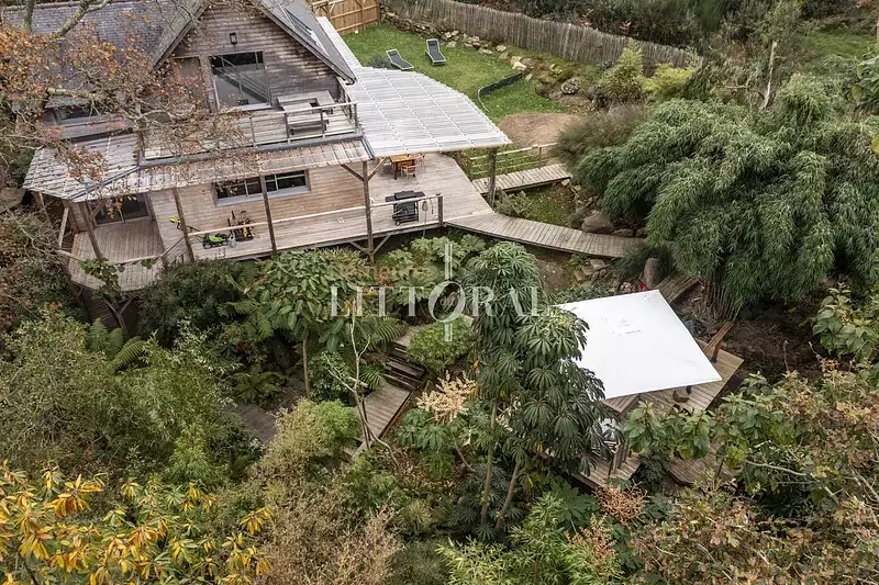 Cette maison en bois de 170 m² (construite en 2010) en parfait état se fond dans l'atmosphère de la forêt et de son jardin japonisant laissant libre cours à la sérénité...Vous serez charmés par les terrasses en bois du jardin, le sentier "zen" entre bambous, chataigniers et chênes, bassin...