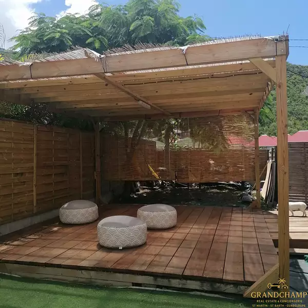 L’extérieur propose un vaste espace de détente incluant un jacuzzi et un ajoupa, parfaits pour savourer des moments de relaxation en toute intimité.