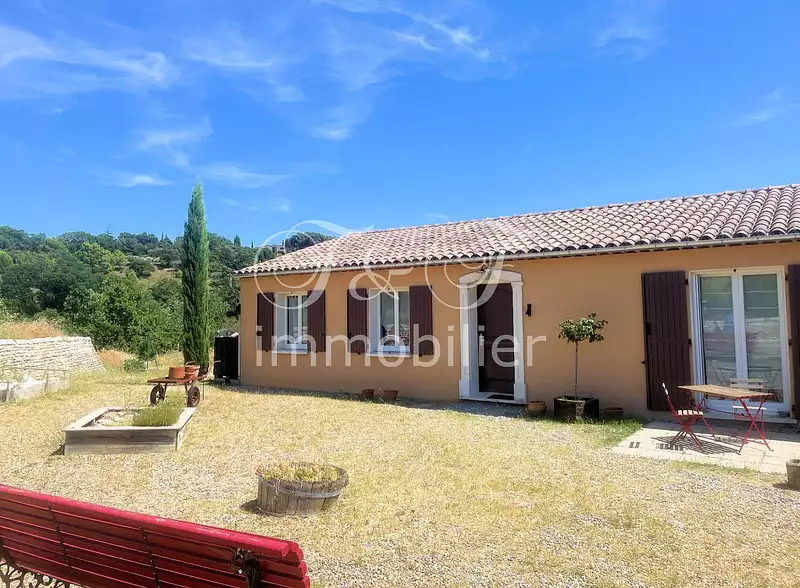 Maison de 107 m2 habitables composée d'une pièce principe de 57 m2, d'une cuisine équipée ouverte, de trois chambres, d'une salle de bain, d'une terrasse de 35 m2 et d'un garage de 27 m2 sur un terrain de 3815 m2. Extension de la maison possible.