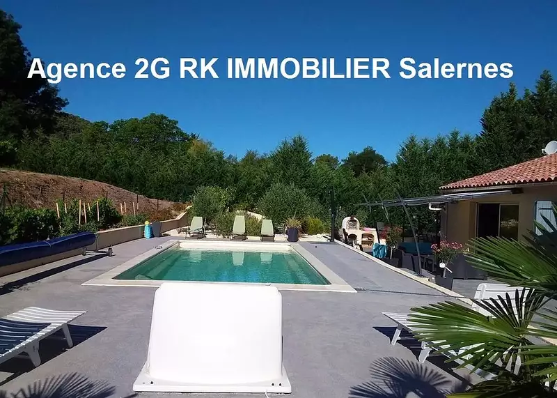Réf. V070. Villa récente Salernes 146 m² hab., 5 chambres + piscine en campagne. Salernes, Var, quartier campagne, sur terrain clos de 1 200 m² avec portail, maison récente de plain-pied 146 m² habitables de très bonne construction ( RT 2012 basse consommation avec murs en briques) composée d’un grand espace à vivre séjour – salon- cuisine ouverte équipée de 50 m², espace nuit disposant d’une suite parentale (chambre, dressing et salle d’eau-wc), de 3 autres chambres avec dressing, salle d’eau et wc séparé. Partie reliée mais pouvant être indépendante composée d’un séjour, d’une chambre et buanderie. Terrasse dallée et piscine 8 x 4 neuve sécurisée (filtre à sable + électrolyse, nage à contre courant, balnéo et barrière de protection). Terrasse 100 m², cuisine d’été équipée sous terrasse couverte, four à pain, barbecue, chalet de 14 m², potager et réserve d’eau enterrée. Belles prestations : climatisation réversible dans séjour, aspiration centralisée, chauffe eau thermodynamique, adoucisseur d’eau, alarme,… Environnement campagne non isolé, dans les vignes et au calme. DPE en cours. Prix en baisse.
