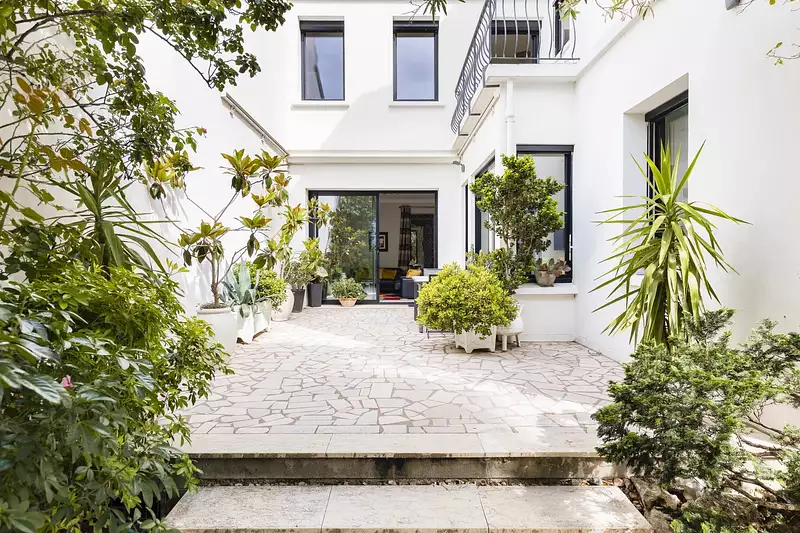 Le rez de jardin présente de belles pièces de réception lumineuses avec une belle hauteur sous plafond; on y trouve une entrée et son vestibule, un séjour lumineux avec une cheminée fonctionnelle, une cuisine ouverte aménagée et équipée donnant sur une terrasse et un jardin intime exposé sud-est à l'abri des regards, un espace bar, un bureau et un wc indépendant.