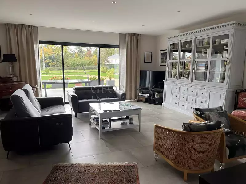 Une entrée principale sur la propriété et une entrée de service accessibles en voiture.La vaste entrée dans la maison dessert la partie jour avec un séjour de 40.95 m² cheminée ouverte ou fermée selon les usages, une cuisine aménagée (Cuisines Schmidt) et très bien équipée 26 m², lingerie, cellier, elle dessert la partie nuit par un couloir donnant accès à 3 chambres, dont une suite parentale avec dressing et salle d‘eau + WC, une salle d’eau indépendante, 2 WC. Une autre entrée dans la maison est possible par la grande terrasse. Nombreux placards. Volets roulants électriques. Garage 30 m² (grenier au dessus) avec une partie atelier et car port attenant. Préau pour le bois