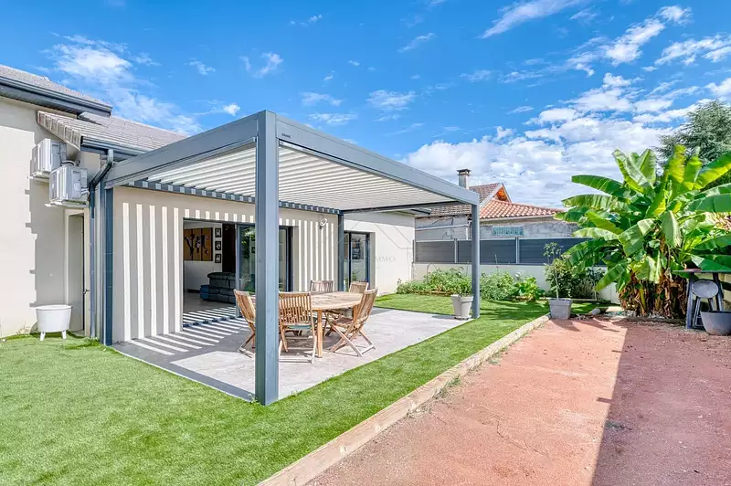 Implantée sur une parcelle de 532 m², la maison dispose d’un jardin soigneusement aménagé et d’une terrasse couverte par une pergola bioclimatique, permettant de savourer chaque saison en extérieur.