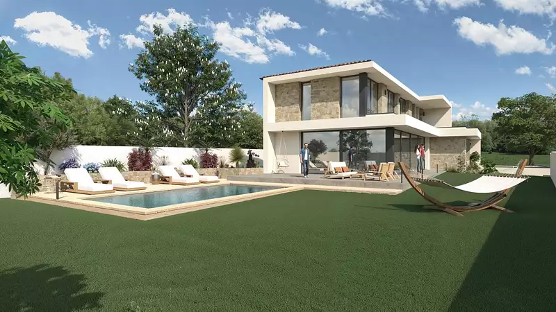 Plans en agence pour maison 4 chambres dont 1 parentale de plain-pied avec terrasse privée, une mezzanine / espace nuit 3 chambres à l'étage avec vue, exploitant au maximum la forme L du terrain, orienté Sud pour la piscine. Dans zone résidentielle et familiale, avec vue dégagée sur le coeur de village et son charmant clocher, mais aussi sur le Mont Verdun ; terrain de près de 1200m2 avec un beau potentiel de construction, zone UB (CES 0.20).