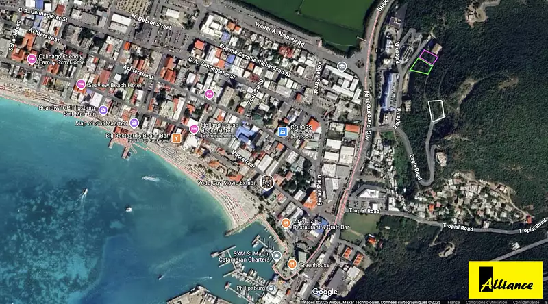 Situation : sur les hauteurs, à proximité immédiate du port, de la plage de Phillipsburg et de ses commerces