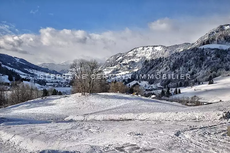 Magnifique terrain d'environ 1300 m2 orienté sud ouest avec une vue panoramique exceptionnelle sur le Mont Charvin. Idéalement situé dans un environnement calme et verdoyant sur une vaste zone agricole. Ce terrain est vendu avec un permis de construire purgé de tous recours des tiers pour un chalet en vieux bois d'environ 200 m2. Il se compose: en rez de jardin : 3 chambres en suite , 1 chambre master avec bains douche avec accès terrasse et jardin, buanderie, local technique. En rez de chaussée: entrée, wc invités, cuisine américaine, salle à manger donnant sur une terrasse , salon cathédral avec cheminée donnant sur terrasse et balcon, un garage double de 41 m2 pour 2 voitures. Combles : Mezzanine.