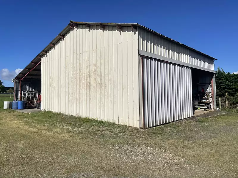 Un hangar de près de 150 m2 , ossature métallique et tôle en très bon état , au sol béton sur un terrain d'environ 1,5 hectatre (14375m2) Eau et Electricité à proximité