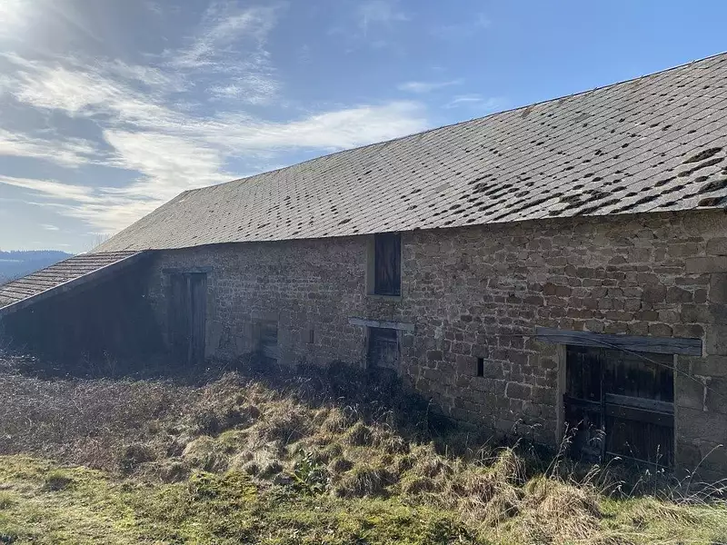 1/ grange limousine environ 200 m² au sol, couverture ardoises fibre ciment, terre battue.