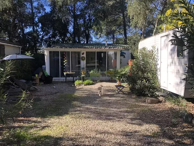 Frejus - domaine du pin de la legue 200 parts sociales de sci formant une parcelle de terrain de 200m² plate, proche des activites et spacieuse. mobil-home 2 chambres dont une communicante avec la salle de douche, grand espace de vie et cuisine equipee + climatisation. grande veranda lumineuse climatisee. grande caravane a rafraichir mais parfaite pour du rangement. 1/2 places de parking, barbecue et electromenager reste. -