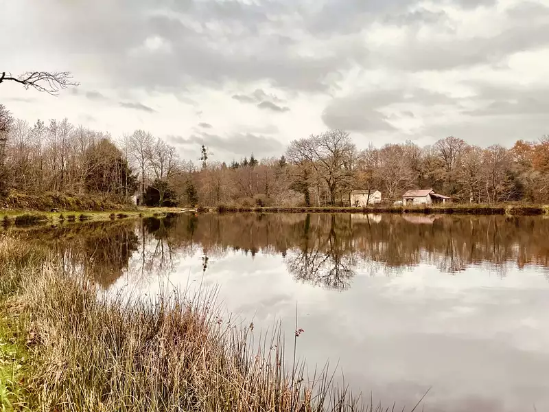 Saint Christophe (16), dans un hameau, un terrain de loisirs sur 2, 47 ha env. bord rivière : un étang conforme empoissonné de 1,3 ha env. avec un bosquet de 7150 m2 et une maisonnette de 17 m2, sans confort, avec une pièce (cheminée, compteur EDF, compteur eau mais non raccordé) + un appentis.