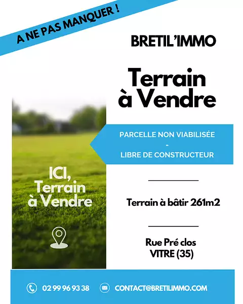 VITRE - QUARTIER HODEYERE - CENTRE VILLE Terrain constructible d'environ 261m² situé "Rue pré clos" à VITRE. Proche du centre-ville, ce terrain offre un cadre de vie agréable, dans un secteur calme et recherché, tout en étant à proximité des commodités (commerces, écoles, transports). Environnement résidentiel Libre de constructeur Viabilisation à proximité et bornage en cours de réalisation. Pour plus d'informations ou organiser une visite, merci de contacter Julien BLANCHET au 06 11 25 16 51 / 02 99 96 93 38 (4.72 % honoraires TTC à la charge de l'acquéreur.)