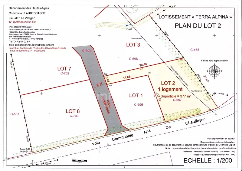 Situé dans un petit lotissement résidentiel de seulement 8 lots, sur la commune de Chauffayer, ce terrain à bâtir de 377 m² (130m² d'emprise au sol max et 260m² de surface plancher autorisée) vous offre un cadre de vie paisible, à deux pas du centre du village et de ses commodités.