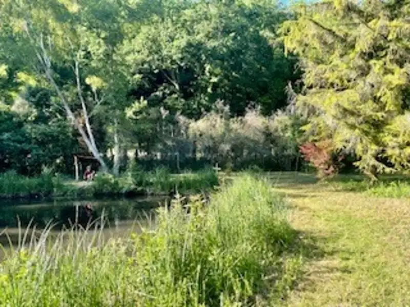 Étang de 500 m2 environ sur un terrain de 3800 m2, avec petite ile.