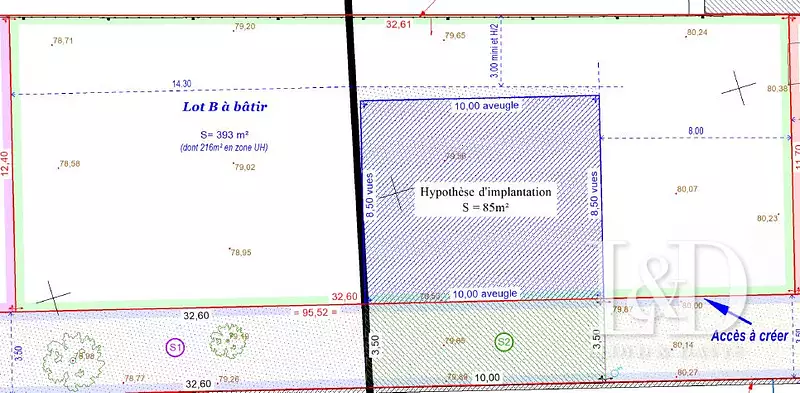 Terrain proche de toutes commodités numéroté Lot B d'une surface de 393 m² accessible par une servitude de passage d'une largeur de 3.5. Capacité de construction 85 m² au sol