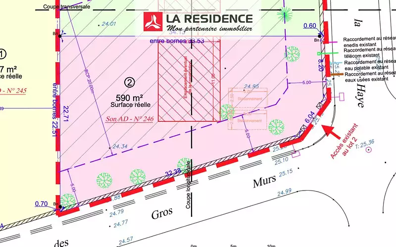 Emplacement de choix - Grand terrain - Proximité des transports en commun - Vue dégagée. . QUARTIER DE LA HAYE - EMPLACEMENT EXCEPTIONNEL. Terrain à Bâtir non viabilisé d'une contenance de 590 m2 cadastré AD N247. Lot 3 du plan en photo. ZONE UDA. Pavillonnaire diversifié. Profondeur de la bande de constructibilité principale est fixée à 20 mètres. La hauteur maximale des constructions dans la Zone UDA varie selon les secteurs : Dans la Zone UDa : La hauteur de façade (Hf) est limitée à 6 mètres (Hf ≤ 6 m). Le volume enveloppe de toiture (VET) est limité à 3,50 mètres (VET ≤ 3,50 m). Le coefficient d'emprise au sol des constructions est limité à 50 % de la superficie du terrain. .