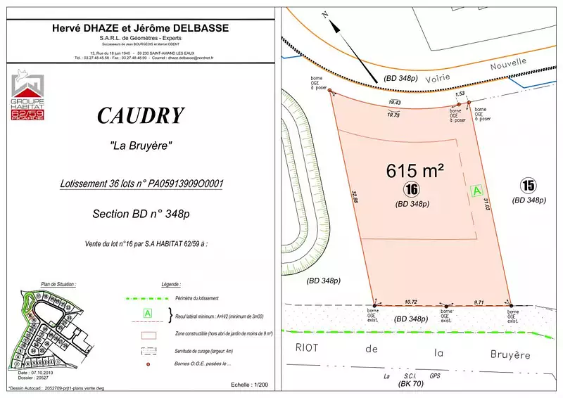 Parcelle libre de constructeur à CAUDRY, route de Clary. Surface 615 m².