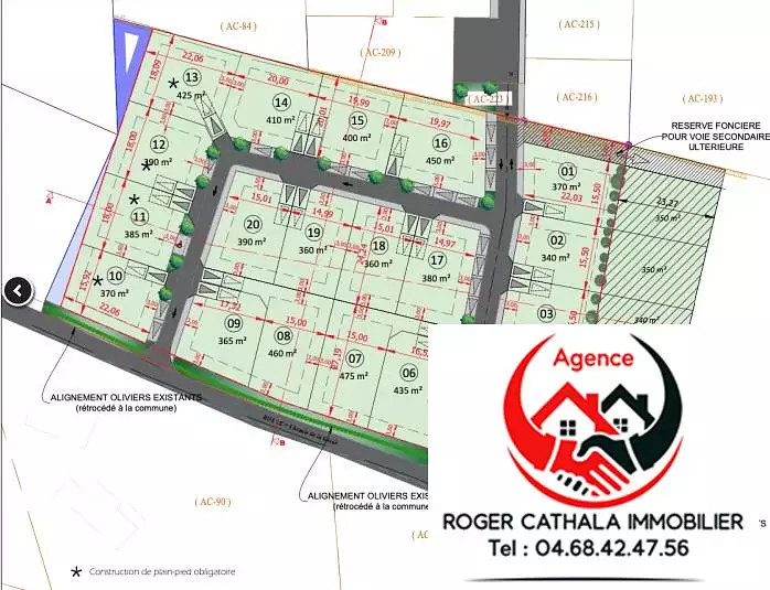 EN EXCLUSIVITÉ. L'AGENCE ROGER CATHALA IMMOBILIER DE GINESTAS Vous proposent, NOUVEAU lotissement à Ginestas de 20 lots viabilisés et libres de construction, des terrains de 360m2 à 870m2 prix à partir de 72 000euros surface constructible 370m2 à proximité des commerces et mairie. Livraison décembre 2025. La présente annonce immobilière a été rédigée sous la responsabilité éditoriale de Mr Roger Cathala Agent immobilier immatriculé au Registre Spécial des Agents Commerciaux (RSAC) du Tribunal de Commerce de Narbonne sous le numéro 88809340800019. Référence annonce : 219 Les honoraires sont à la charge du vendeur