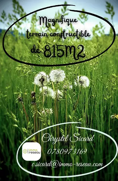 Maginfique terrain de 815M2 A l'orée d 'une forêt avec vue dégagée sur les montagnes ce magnifique TERRAIN CONSTRUCTIBLE et viabilisé vous offrira la possibilité de construire la maison de vos rêves,libres constructeurs avec une surface plancher maximum de 180 M2 . Dans un environnement calme mais neanmoins proches de toutes les commodités :écoles ,supermarchés ,petits commerces proches des axes autoroutiers,ne tardez pas pour prendre RV de votre futur lieu d'habitation une visite s 'impose . Vous souhaitez en savoir plus ,je vous invite à me téléphoner pour qu'ensemnble nous puissions construire votre projet . Prix de vente 129 585 € Prix TTC et Honoraires à charge vendeur TTC Prix de vente 129 585 € Prix TTC et Honoraires à charge vendeur TTC Pour visiter et vous accompagner dans votre projet, contactez Chrystel SICARD 07 80 97 31 69 Prix TTC et Honoraires à charge vendeur TTC Prix de vente 129 585 € Selon l'article L.561.5 du Code Monétaire et Financier, pour l'organisation de la visite, la présentation d'une pièce d'identité vous sera demandée. Les informations sur les risques auxquels ce bien est exposé sont disponibles sur le site Géorisques : www.georisques.gouv.fr Cette présente annonce a été rédigée sous la responsabilité éditoriale de Chrystel SICARD agissant sous le statut d'agent commercial immatriculé au Ville du greffe : MANOSQUE sous le numéro RSAC N° 434 935 367 auprès de la SAS IMMO RESEAU au capital de 10 000€ - Réseau national immobilier sur internet, 44 Allée des Cinq Continents - 44120 VERTOU - RNE NANTES 519 718 886. Carte professionnelle T et G n° CPI 3002 2018 000 024 971 CCI de Nantes-Saint-Nazaire (44) Garantie par GALIAN - 89 rue de la Boétie - 75008 Paris N°171379G pour 120 000€ pour T. Assurance responsabilité civile professionnelle par GALIAN n° de police 120 137 405 (réf. 35946) - Le professionnel garantit et sécurise votre projet immobilier Prix de vente 129 585 € Prix TTC et Honoraires à charge vendeur TTC