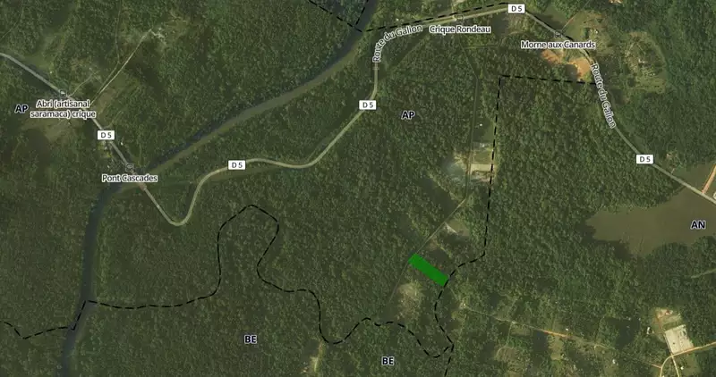 En Guyane, le long du CD5 et proche du carrefour de la RN2, juste après l'intersection de Roura, lieu-dit "Solitaire" à 2 mn du pont des cascades et de la rivière du même nom; Au bord de la crique Benoit, SAFTI vous propose une parcelle rectangulaire, cadastrée, non défrichée de ~8500m2 (20 mn de Cayenne, 10 de l'aéroport) chemin carrossable, et la possibilité d'acquérir la parcelle voisine (~9800m2) plate, reposante et aux portes des villes / facile d’accès