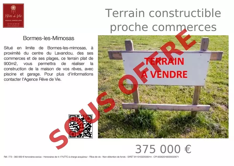 Situé en limite de Bormes-les-mimosas, à proximité du centre du Lavandou, des ses commerces et de ses plages, ce terrain plat de 900m2, vous permettra de réaliser la construction de la maison de vos rêves, avec piscine et garage. Pour plus d'informations contacter l'Agence Rêve de Vie.