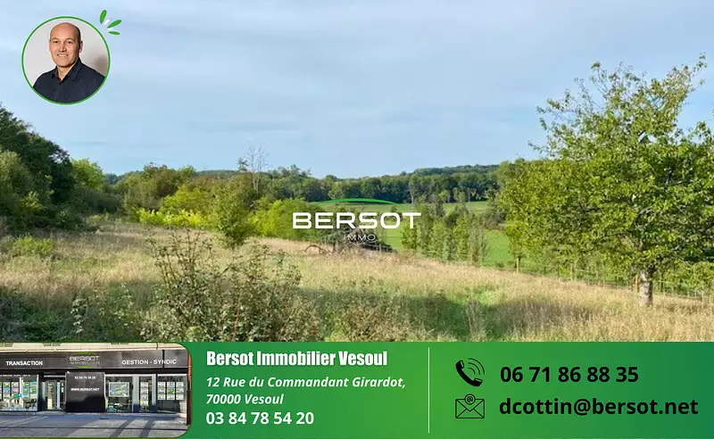 Bersot immobilier Vesoul vous propose un terrain constructible de 994m2 viabilisé avec coffret électrique, tout à l'égout , eau et coffret PTT en bordure ,hors lotissement avec vue imprenable. Merci de contacter David COTTIN au 06 71 86 88 35 pour de plus amples enseignements.