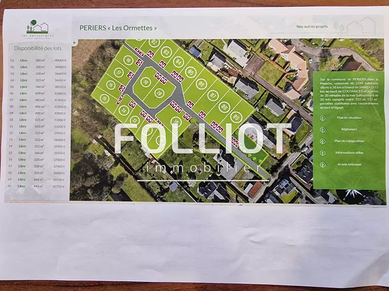 Sur la commune de PERIERS dans la Manche, commune de 2244 habitants située à 28 km à l'ouest de SAINT LO, 17 km au nord de COUTANCES et à moins de 20 minutes de la mer Lotissement de 20 lots compris entre 315 et 515 m², parcelles viabilisées avec raccordement au tout à l'égout. Les informations sur les risques auxquels ce bien est exposé sont disponibles sur le site Géorisques : www.georisques.gouv.fr. Les honoraires sont la à charge de l' acquéreur pour un montant de 5500 euros TTC par lot