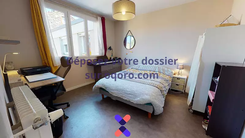 Mobilier : un lit double, un placard, une commode de rangement, un bureau et une chaise.