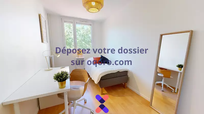 La chambre de 9m2 est équipée avec lit simple, bureau, miroir, commode et placard de rangement.