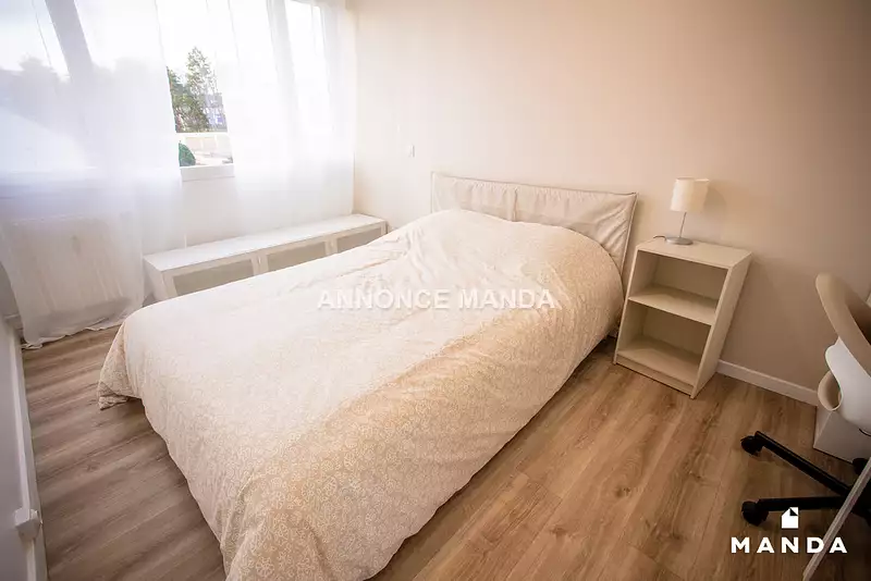 La chambre concernée, qui est la première dans la visite virtuelle, dispose d'un lit double, d'une armoire et d'un bureau. La salle de bain, quant à elle, d'une douche et d'un lave-linge.