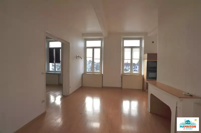 Place de la Republique Corbie appartement de 110 m2 en duplex comprenant entrée spacieuse au rdc , au premier sejour double avec cuisine aménagée, salle de bain et douche, bureau, wc, au second wc, 2 chambres, chauffage central gaz de ville