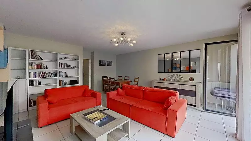 - Un séjour lumineux avec un espace repas, une bibliothèque et une TV. Ainsi qu'un accès direct à une terrasse privative.