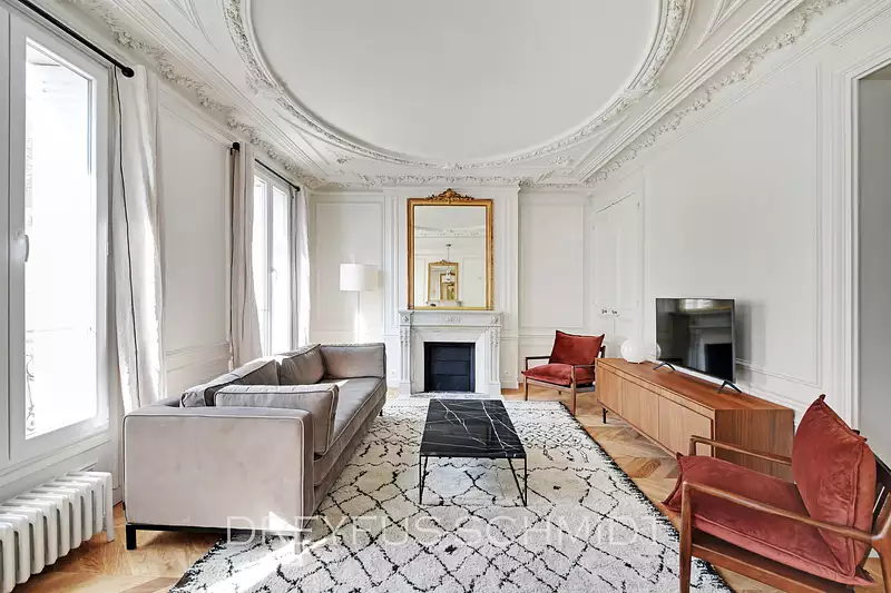 Cet appartement d'exception qui a conservé tout le charme de l'haussmannien est composé d'une belle et grande entrée qui dessert une double réception pourvue de 4 portes fenêtres, accueillant un séjour et un espace dinatoire attenant à la cuisine entièrement équipée.