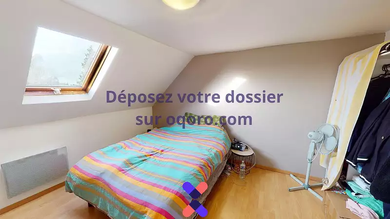 Cette chambre située au dernier étage de la colocation est équipée d'un lit double, un placard de rangement ainsi que d'un bureau et une chaise.