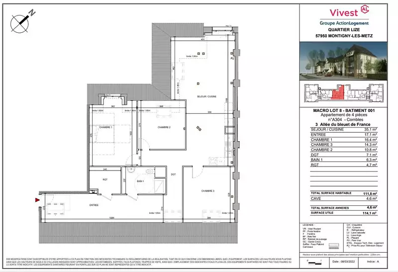 | 111 m² - 4 pièces - 3 chambres | Dernier étage (3ème) |