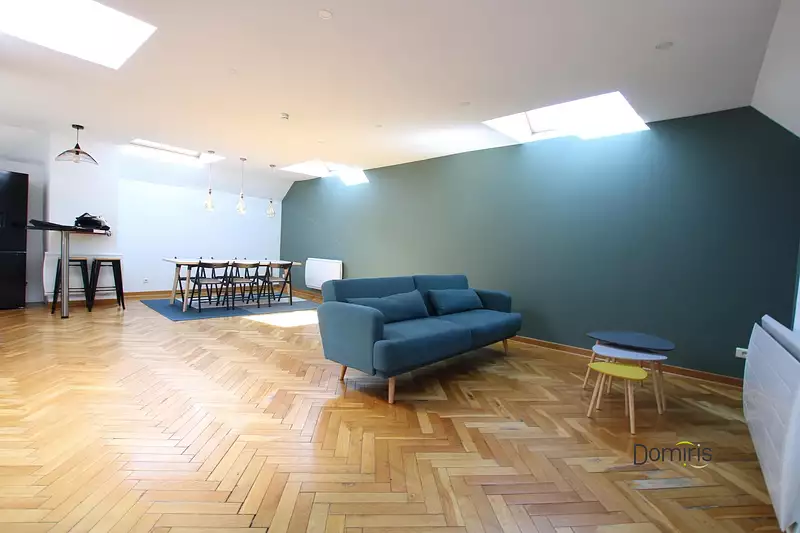 L'appartement de 118m² vous propose un agréable séjour avec parquet chevron qui donne sur une cuisine moderne et équipée.