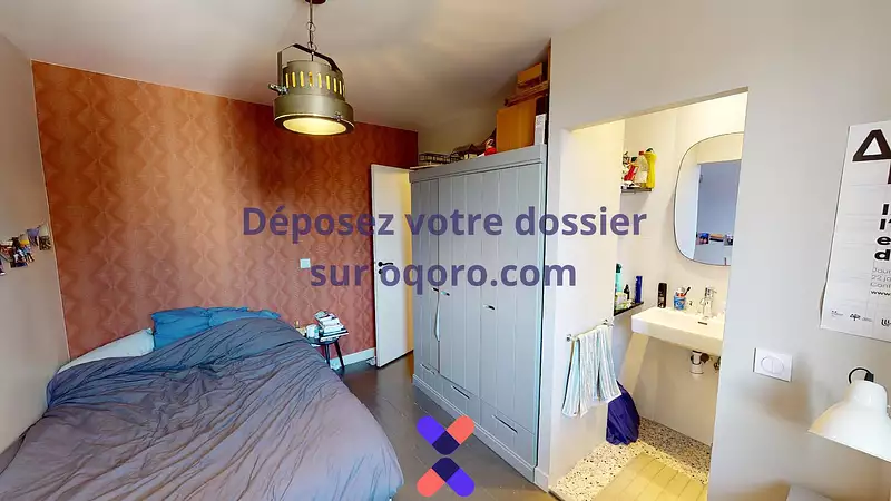 La chambre 4 est munie d'un lit double, d'un grand placard, de rangement, d'un bureau, d'une chaise de bureau, d'une lampe de bureau, ainsi que d'une salle d'eau munie de sa douche et de son évier.