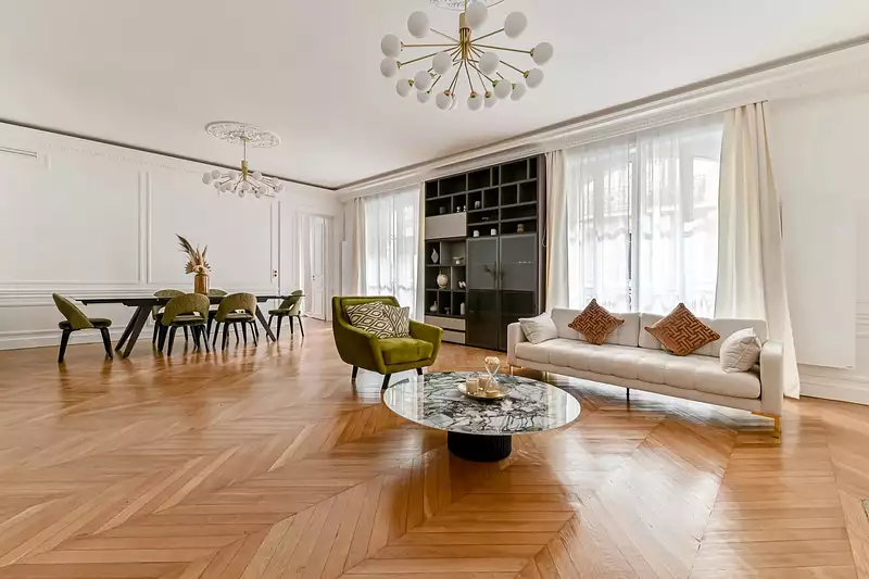 Situé au 1er étage avec ascenseur, il offre tout le charme classique : parquet en point de Hongrie, moulures élégantes, cheminées d’époque et belle hauteur sous plafond.