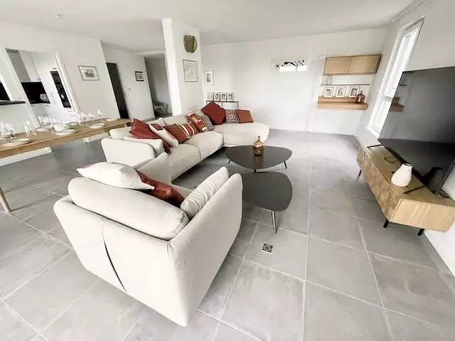Vaste entrée carrelée avec rangements qui dessert une pièce de vie de plus de 46 m², une cuisine ouverte aménagée et équipée de plus de 13 m² et le tout donnant sur un balcon de 18 m², wc séparé et cellier.