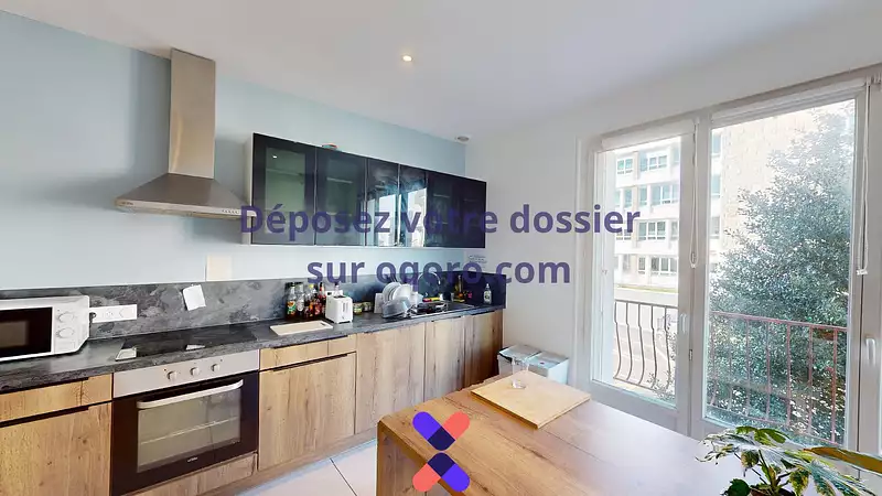 Une 2ᵉ pièce de vie est disponible avec deux tables à manger, et une cuisine ouverte. Elle donne accès à un balcon. La cuisine est équipée avec four, plaque de cuisson et hotte, frigo, lave-vaisselle et rangements.