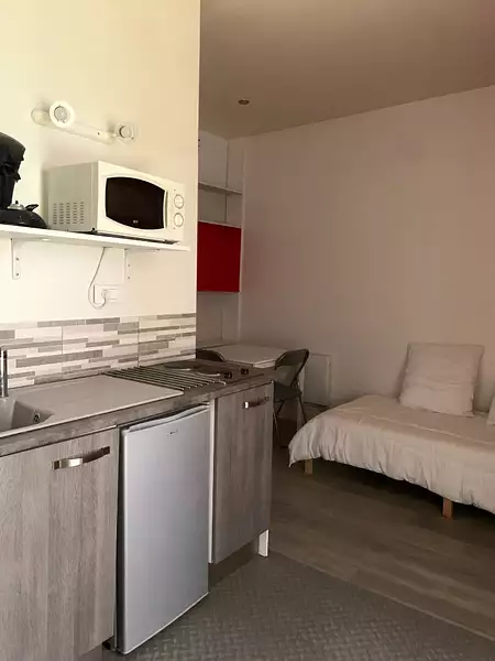 Jolie studio meublé, au calme en centre ville une entrée, un coin cuisine équipée ouverte sur la pièce de vie, salle de douche, WC. une terrasse Disponible mi-novembre