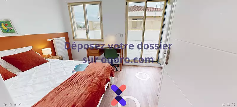 Elle est équipée d'un lit (double), bureau, placard de rangement et commode de chevet. Elle possède aussi une salle d'eau privative avec douche et meuble vasque.