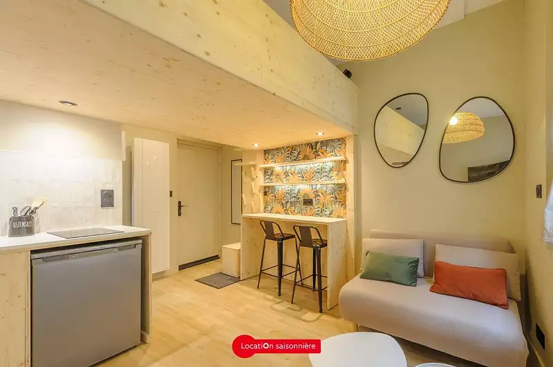 Au 2ème étage d'une résidence sécurisée, Appartement entièrement rénové comprenant : pièce de vie avec coin salon ( canapé - Tv), coin cuisine, espace bureau / snack, lit cabane double, une salle d'eau avec wc.
