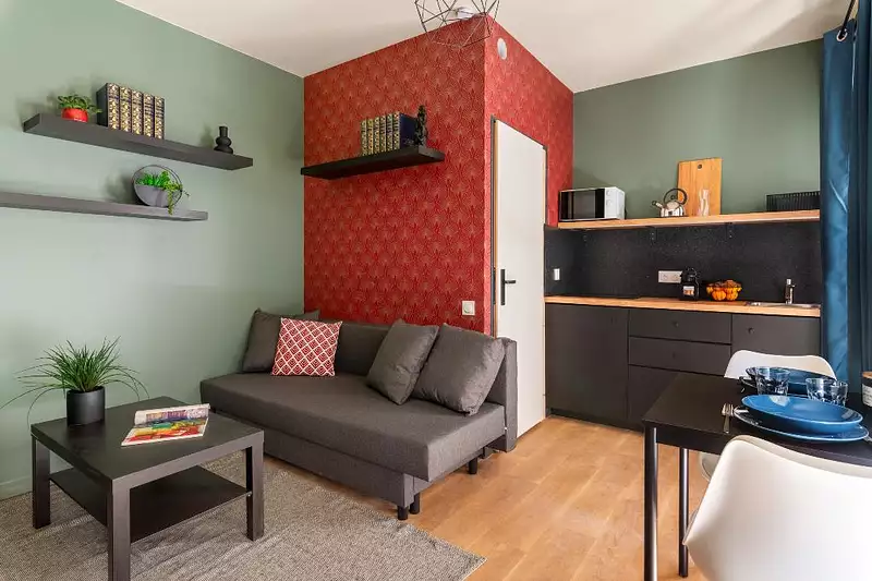 Pièce principale : Un espace lumineux avec coin salon confortable (canapé convertible), dressing spacieux, bureau et grande TV 4K pour vos moments de détente ou de travail.