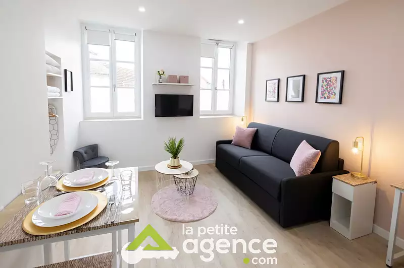MONTLUCON - Proximité immédiate de l'hôpital, de l'école d'infirmière, et du centre ville, au 2ème étage sans ascenseur d'une résidence sécurisée, venez découvrir ce charmant studio d'environ 19m2 rénové, meublé et décoré avec goût comprenant une kitchenette aménagée et équipée (plaque électrique 2 feux, hotte, lave-vaisselle, réfrigérateur, micro-ondes, vaisselle et ustensiles) une salle d'eau/wc, et une pièce de vie. Climatisation réversible. L'immeuble est équipée d'une laverie commune avec lave-linge et sèche-linge. Facilité de stationnement à proximité. Libre le 9 août 2025. Loyer CC: 430€ (acompte eau, taxe des ordures ménagères, entretien et minuterie des communs, accès laverie, internet) - Dépôt de garantie: 780€ - Honoraires d'agence: 205€