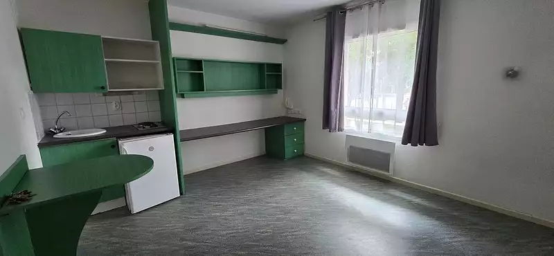 Agréable studio semi-meublé (kitchenette équipée - bureau aménagé- grand placard avec partie penderie et partie étagère) situé dans résidence sécurisée avec services (laverie, salle de sport, salle de travail, accueil) idéal pour étudiants. Le studio se compose d'une kitchenette équipée, bureau aménagé, grand placard avec partie penderie et partie étagère, salle d'eau. Chauffage individuel électrique.