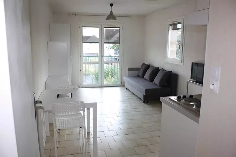 Equipement : Canapé lit, Armoire penderie, étagère, Table avec 2 chaises, réfrigérateur, four - micro-onde, plaques électriques, vaisselle, linge de lit, etc.