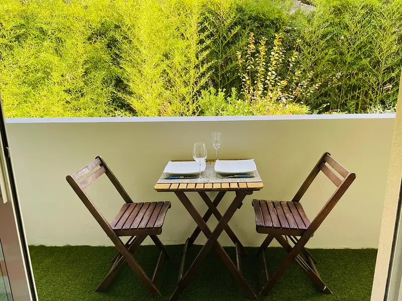Le séjour lumineux avec son coin cuisine s’ouvre sur un balcon donnant sur la verdure, créant une atmosphère paisible et conviviale.