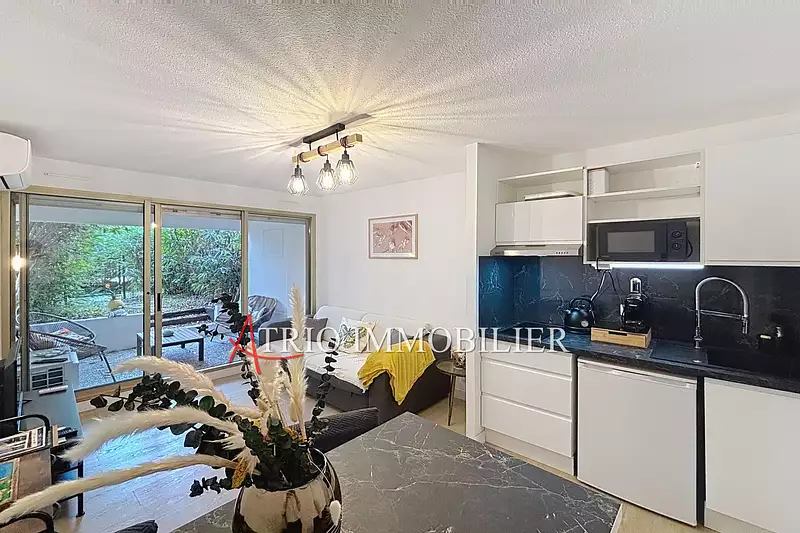 L'appartement se compose d'une entrée cabine avec lit, d'une salle d'eau avec WC, d'un coin rangement pratique et d'un séjour/cuisine offrant un accès direct à une belle terrasse/jardin.