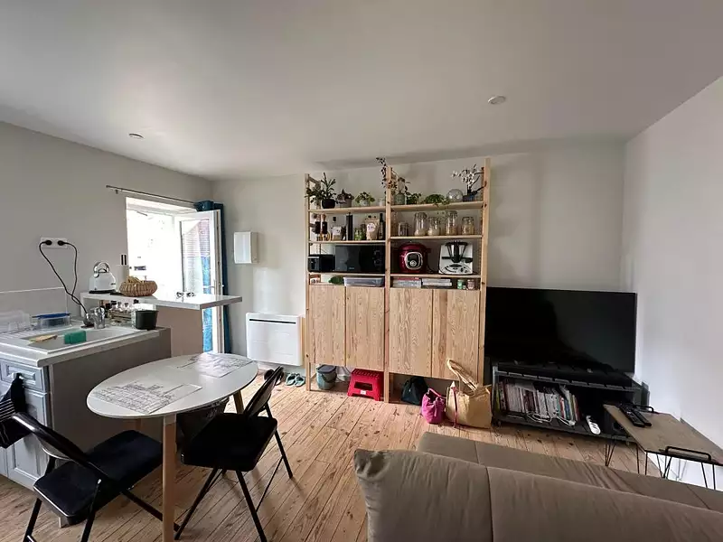 Séjour avec cuisine aménagée équipée, salle d'eau avec WC, à l'étage, une chambre. Cave privative avec possibilité de branchement lave linge.
