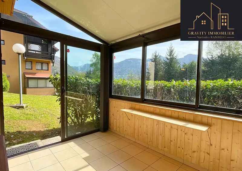 Une entrée avec un lit simple, une salle d'eau entièrement rénovée, un espace kitchenette, salon et une belle véranda complètent ce bien.